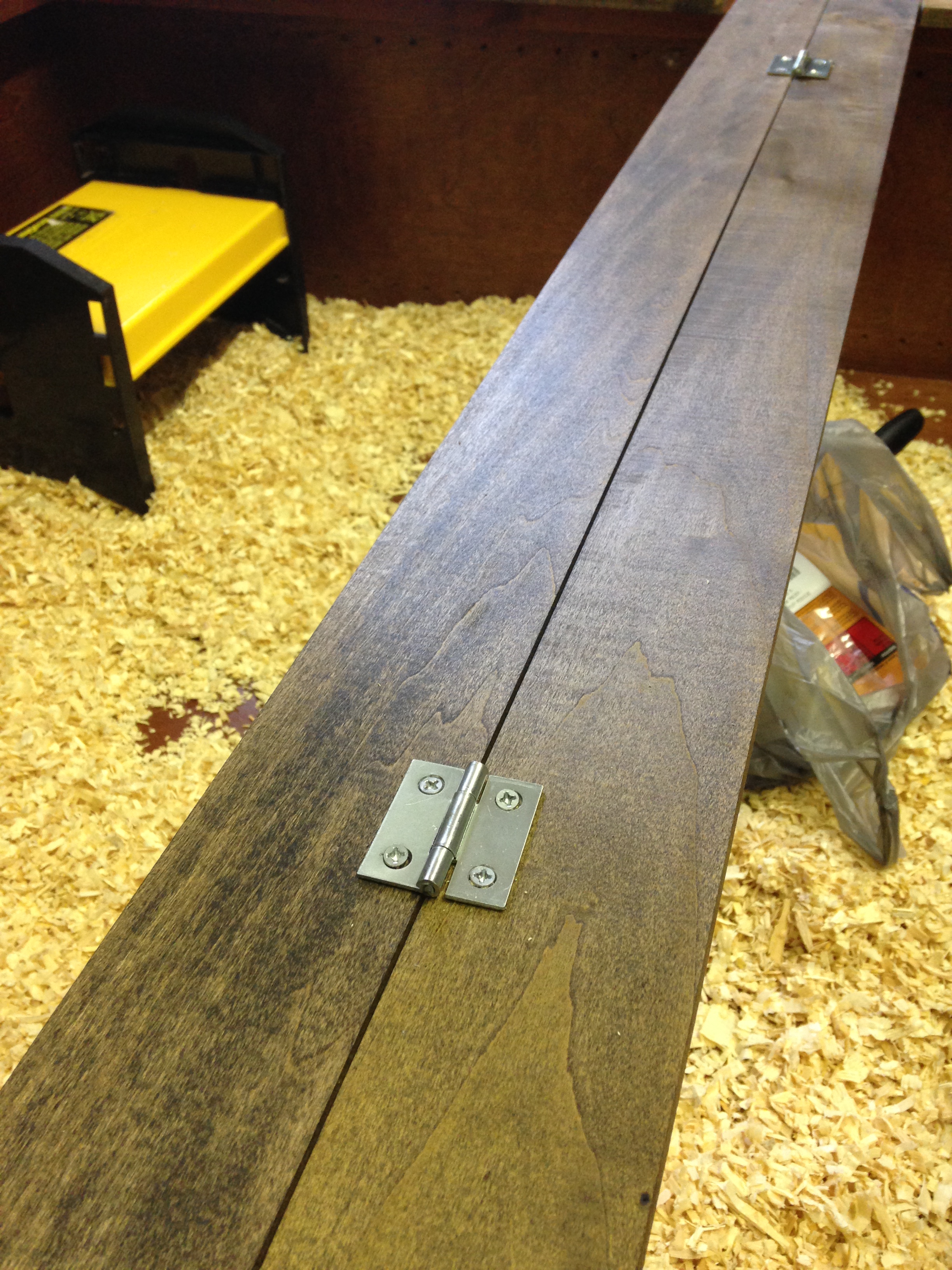 Once my wood was dry, I screwed together a frame using my corner braces, then attach the hinges for my door so I easily access the chickens.