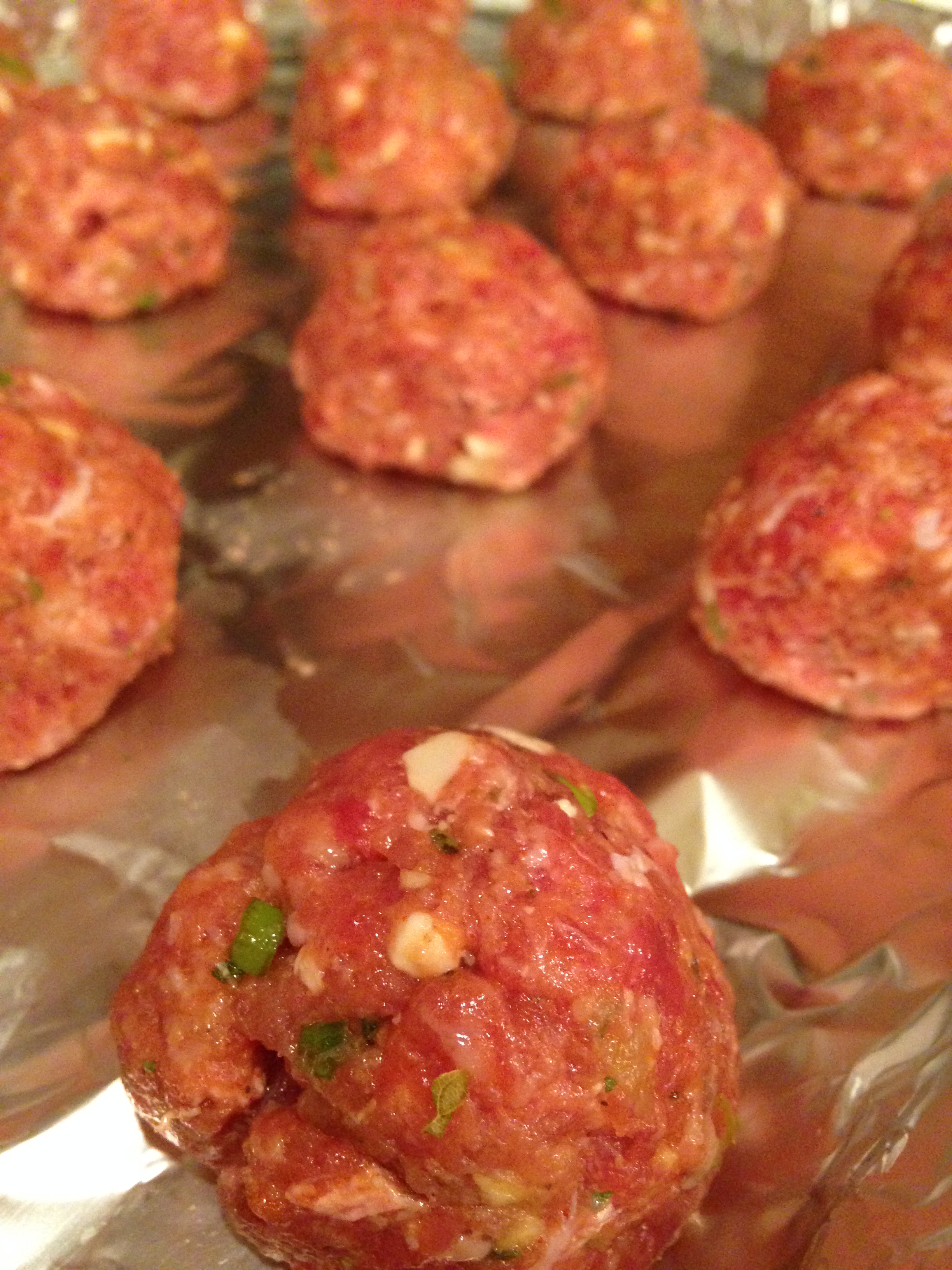 In a large mixing bowl combine all your ingredients except the bleu cheese. Using your hands combine the mixture thoroughly, then fold in the blue cheese. Stir just to combine. Roll your meatballs and place on a foil lined baking sheet.
