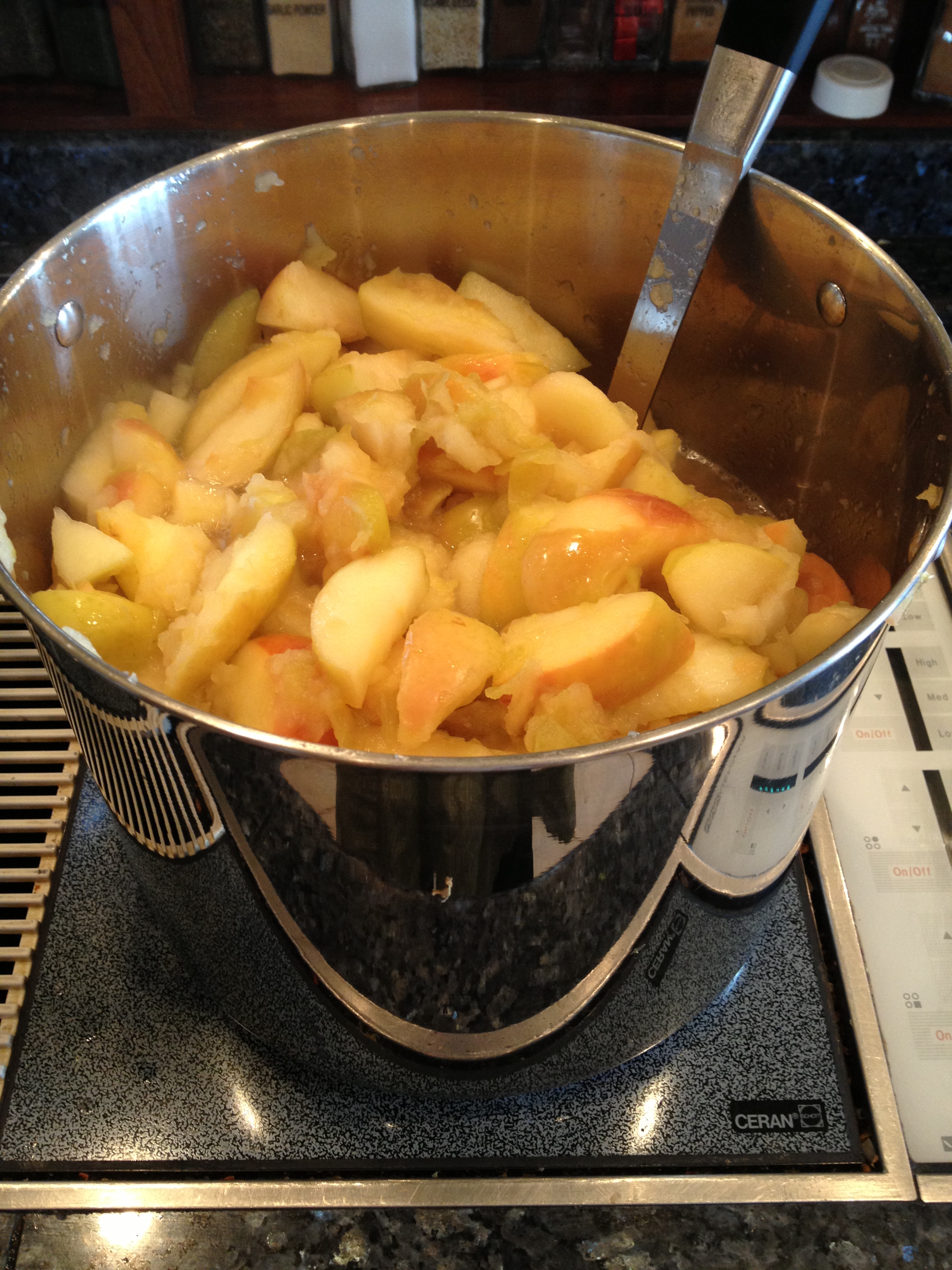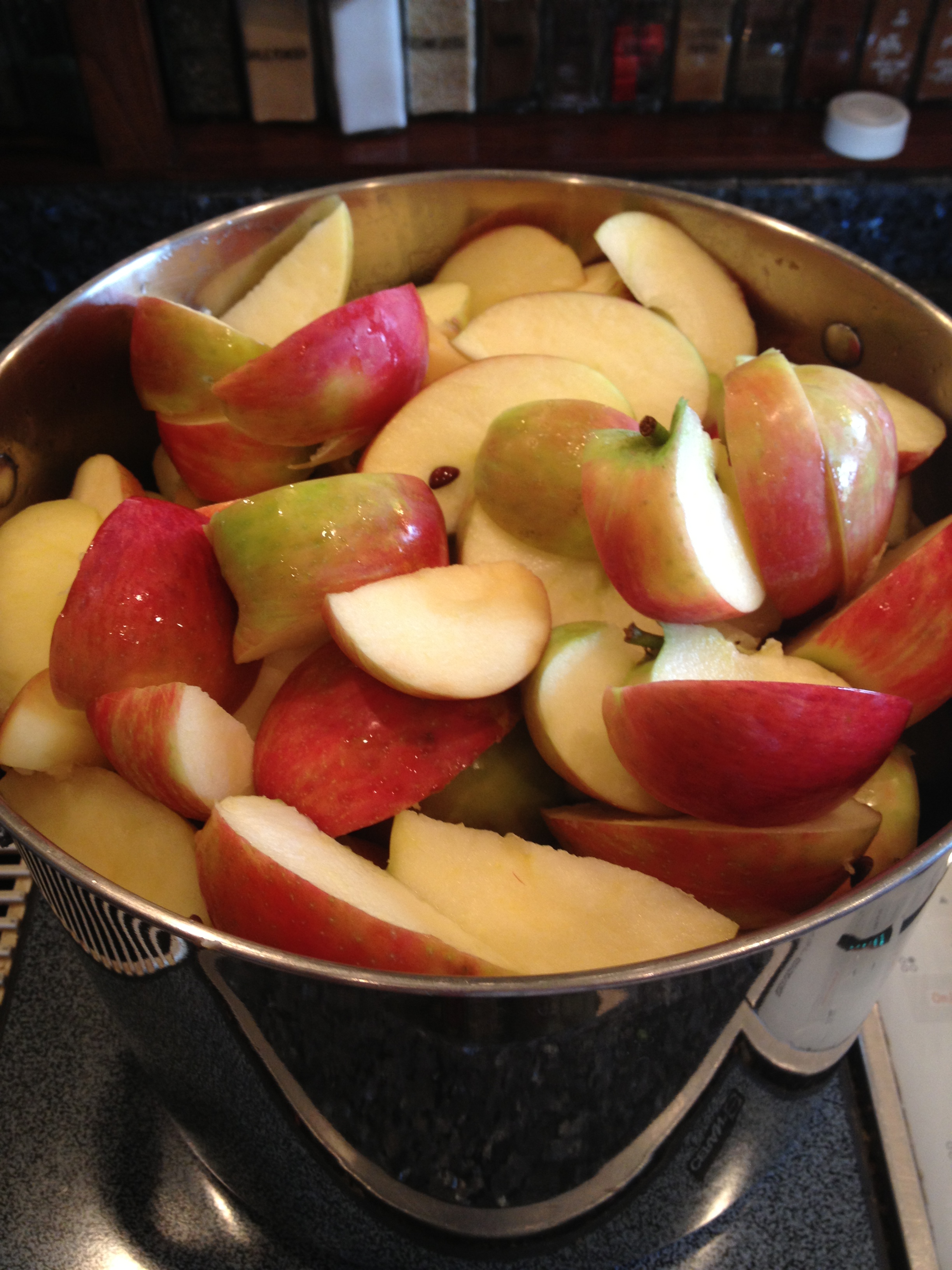 1.) Add water to a large stock pot over med/high heat. Quarter apples, tossing them into the stock pot as you go. Reduce heat, stirring as you go, if apples begin to stick to the bottom, add a wee bit more water.