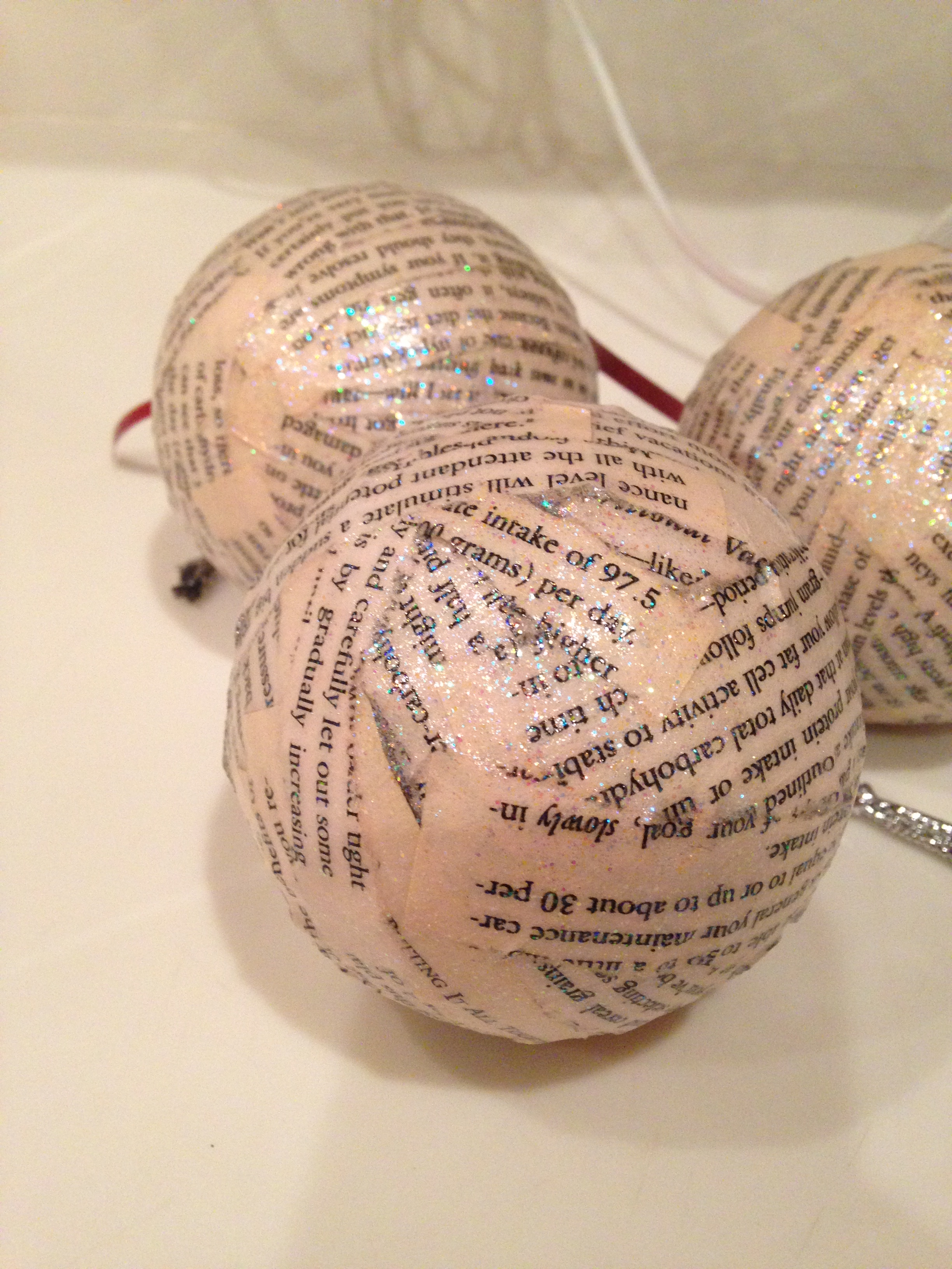 Using the foam brush apply a generous layer of Mod Podge on half of the ornament. Firmly press 1 strip on the Mod Podged ornament. Topcoat the strip of paper with MP, making sure the entire strip of paper is covered well with the MP. Repeat until the entire ornament is covered with strips of paper and coated with modpodge. Allow the MP to dry for a 1/2 hour and then apply one more coat using the foam brush.