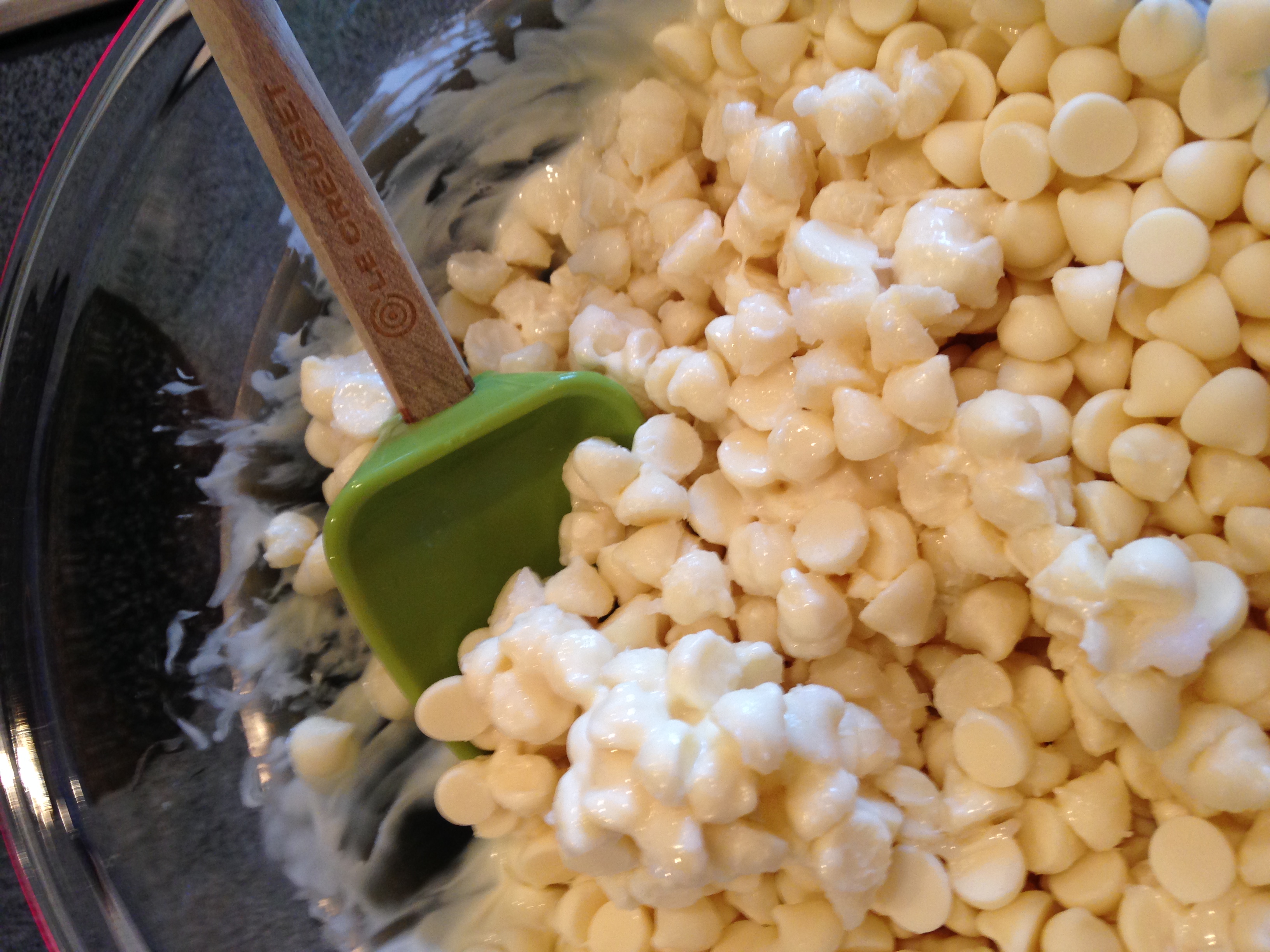 Continue the same process with your white chocolate, adding in 2 teaspoons coconut oil and 1 teaspoons peppermint extract.