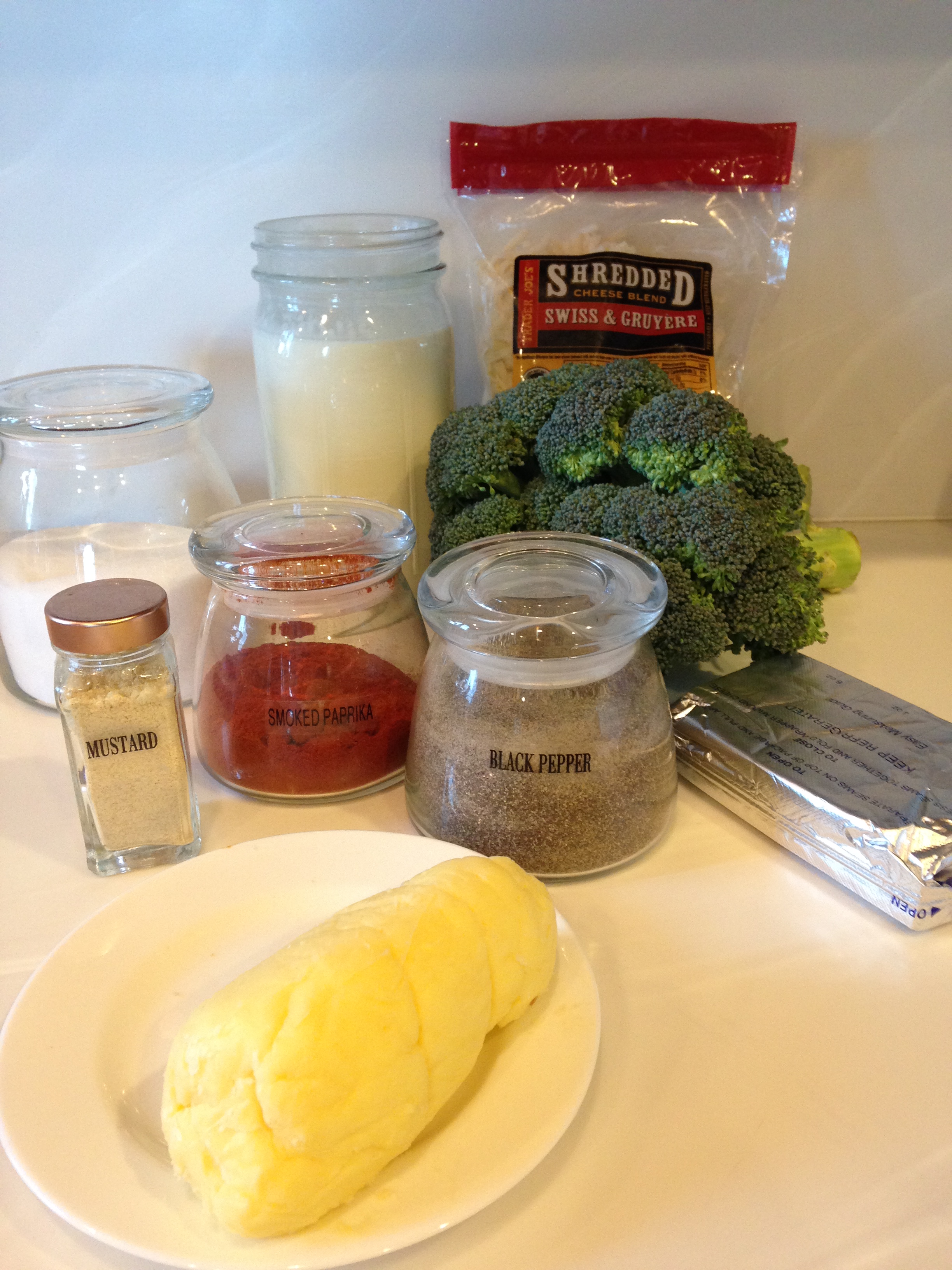 In a large sauté pan over medium heat, melt butter. Add garlic and sauté until just aromatic. Pour in heavy cream and cream cheese. Using a wire wisk, stir until well combined and cream cheese is fully melted. Wisk in dried mustard, salt, pepper and smoked paprika. Add in swiss/gruyere cheese ½ cup at a time, repeat until all the cheese has been add and it is all melted. Finally add in chopped cauliflower or broccoli, stirring until well coated.