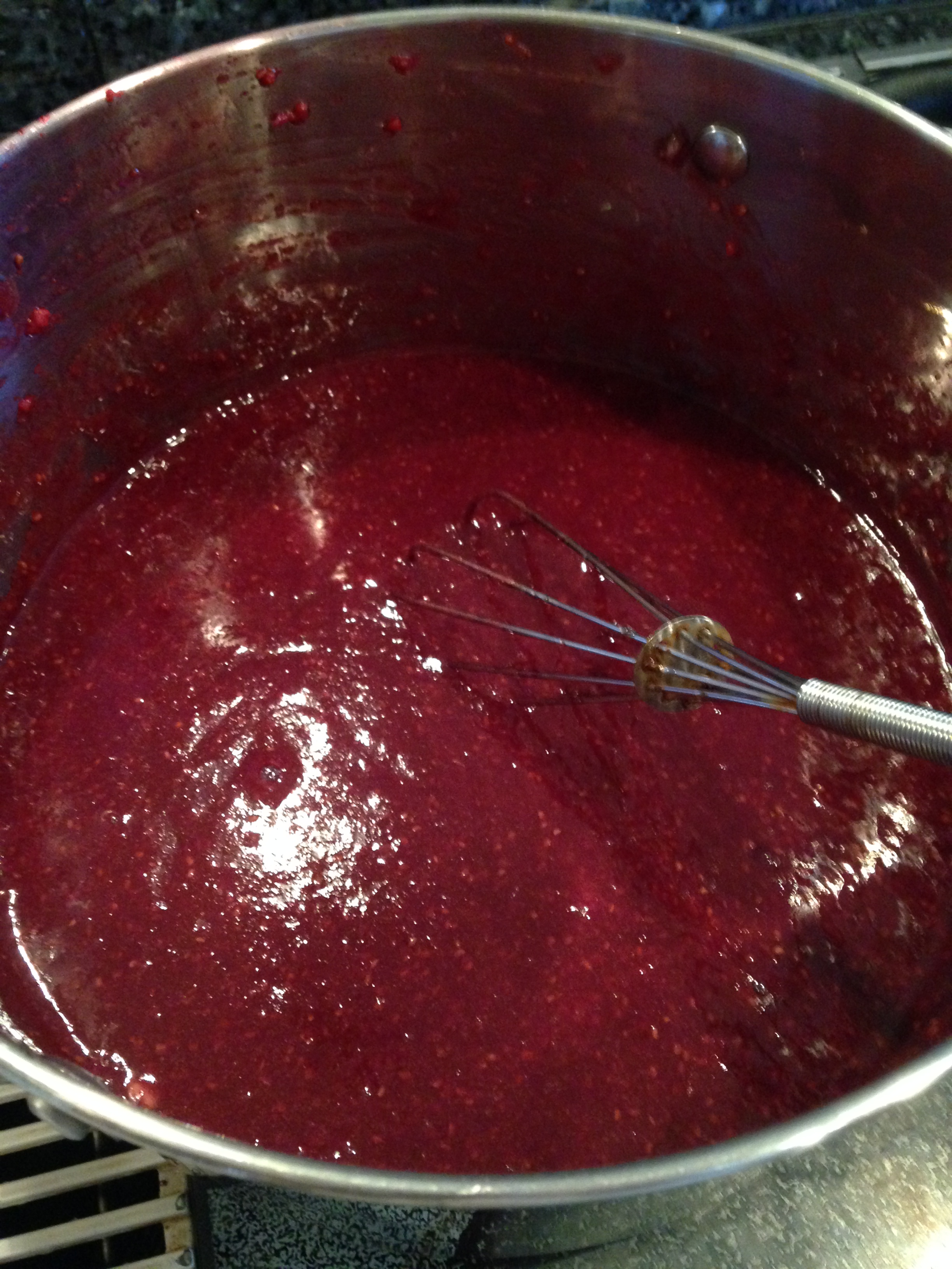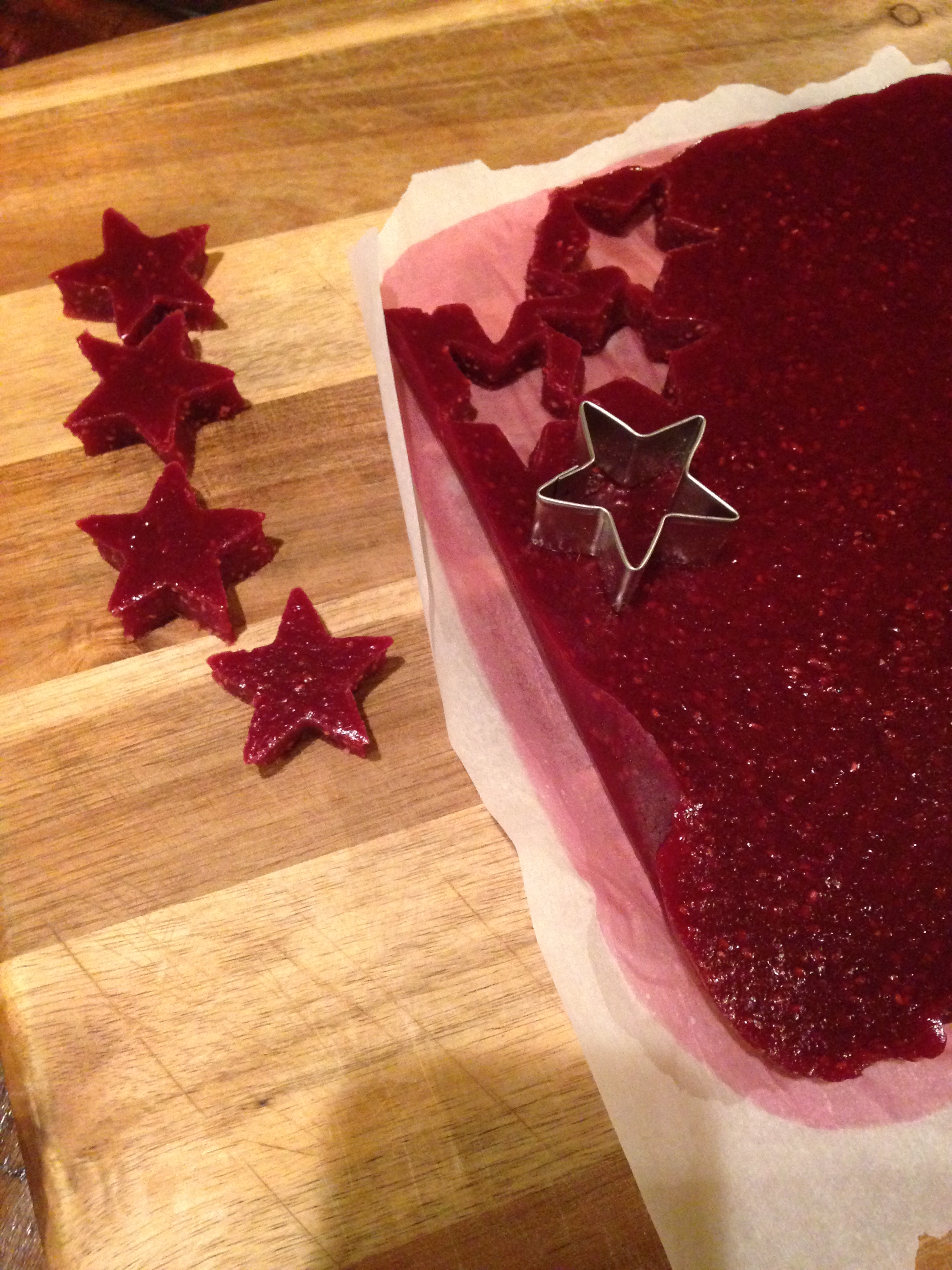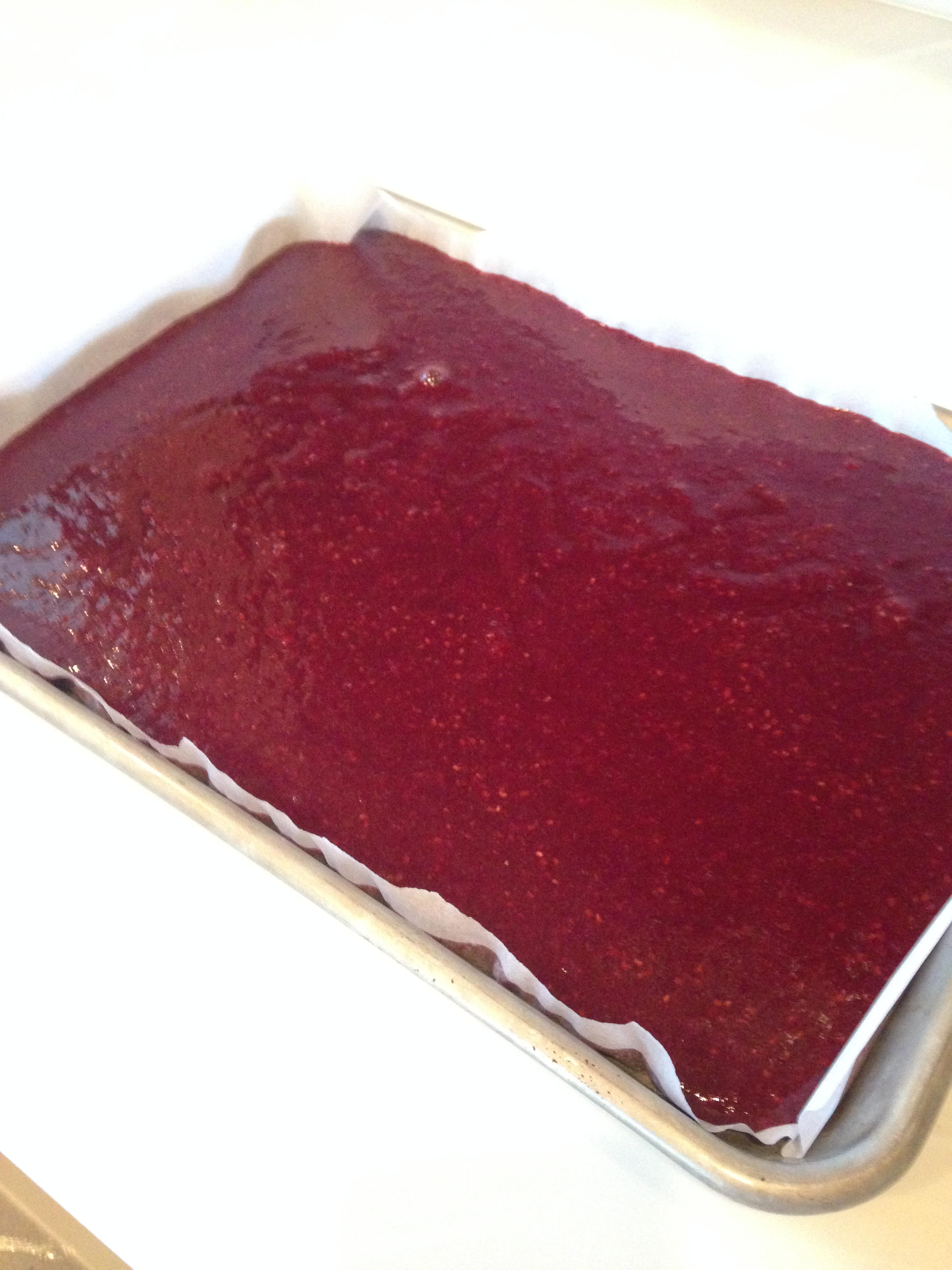 In a sauce pan, heat your berries (I used raspberries and 1/2 a dozen strawberries) over medium a burner until thoroughly heated, stirring frequently to prevent any scorching. Once the berries have heated all the way through and melted down, carefully pour them into a blender, blend just until smooth. Carefully return the berries to to the saucepan and add in the honey and the gelatin, continue to heat on low-med heat combining with a wire whisk, until the gelatin is smooth and melted. Remove from the heat and carefully pour into a 9×13 glass baking dish or a parchment lined baking sheet.