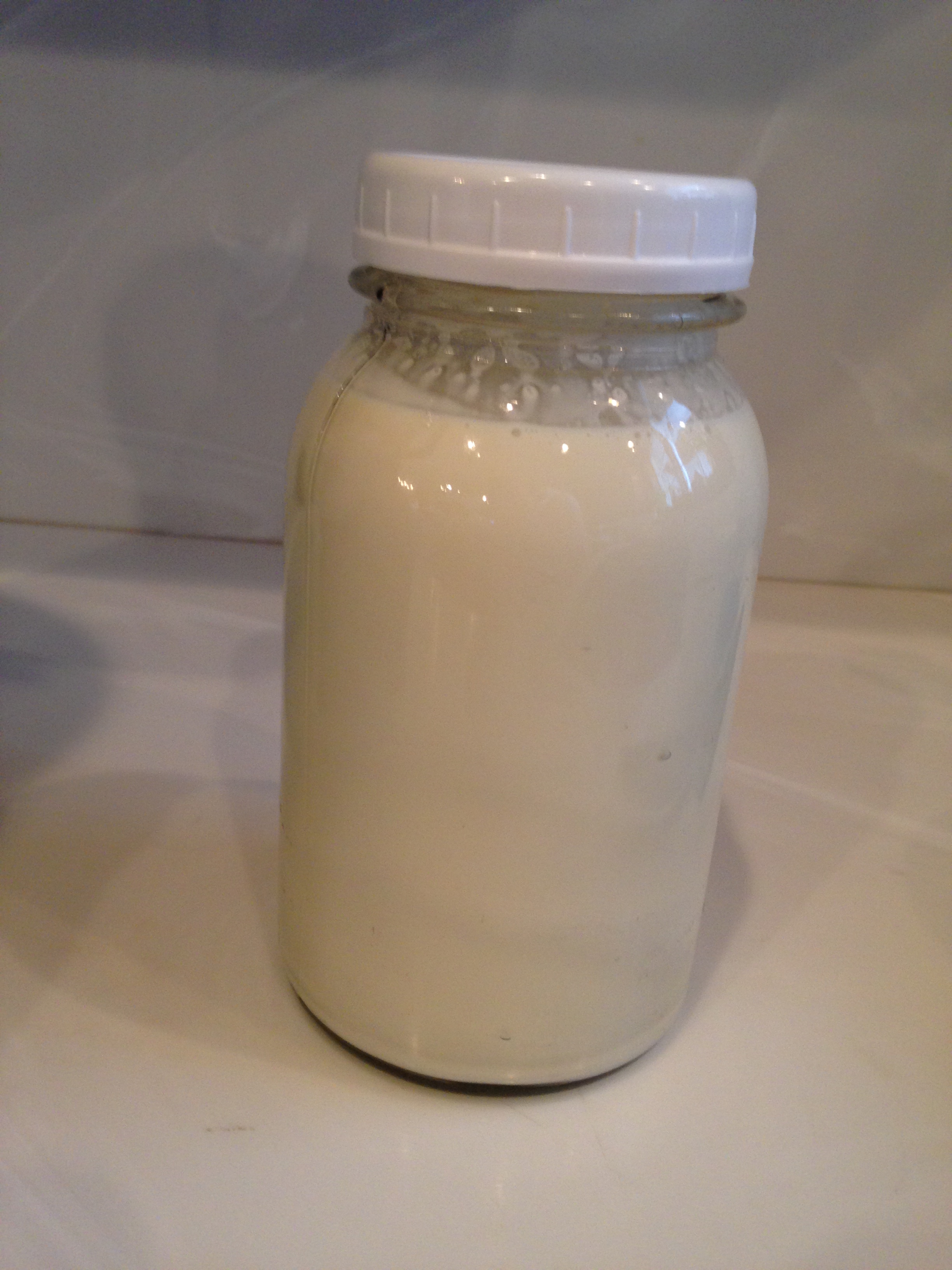 1. In a 1 quart jar, combine the 1 cup cultured “buttermilk” with the 3 cups fresh raw milk. Shake and Cover.