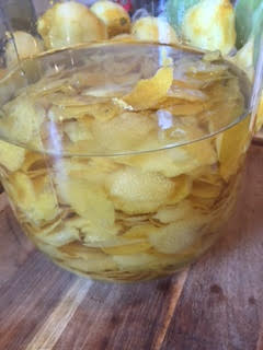 Once the limoncello is ready to bottle up, strain the lemon rinds from the vodka and return vodka to the gallon jar. Add the simple syrup (recipe above) to the vodka. Using a funnel bottle up the limoncello into air tight bottles.