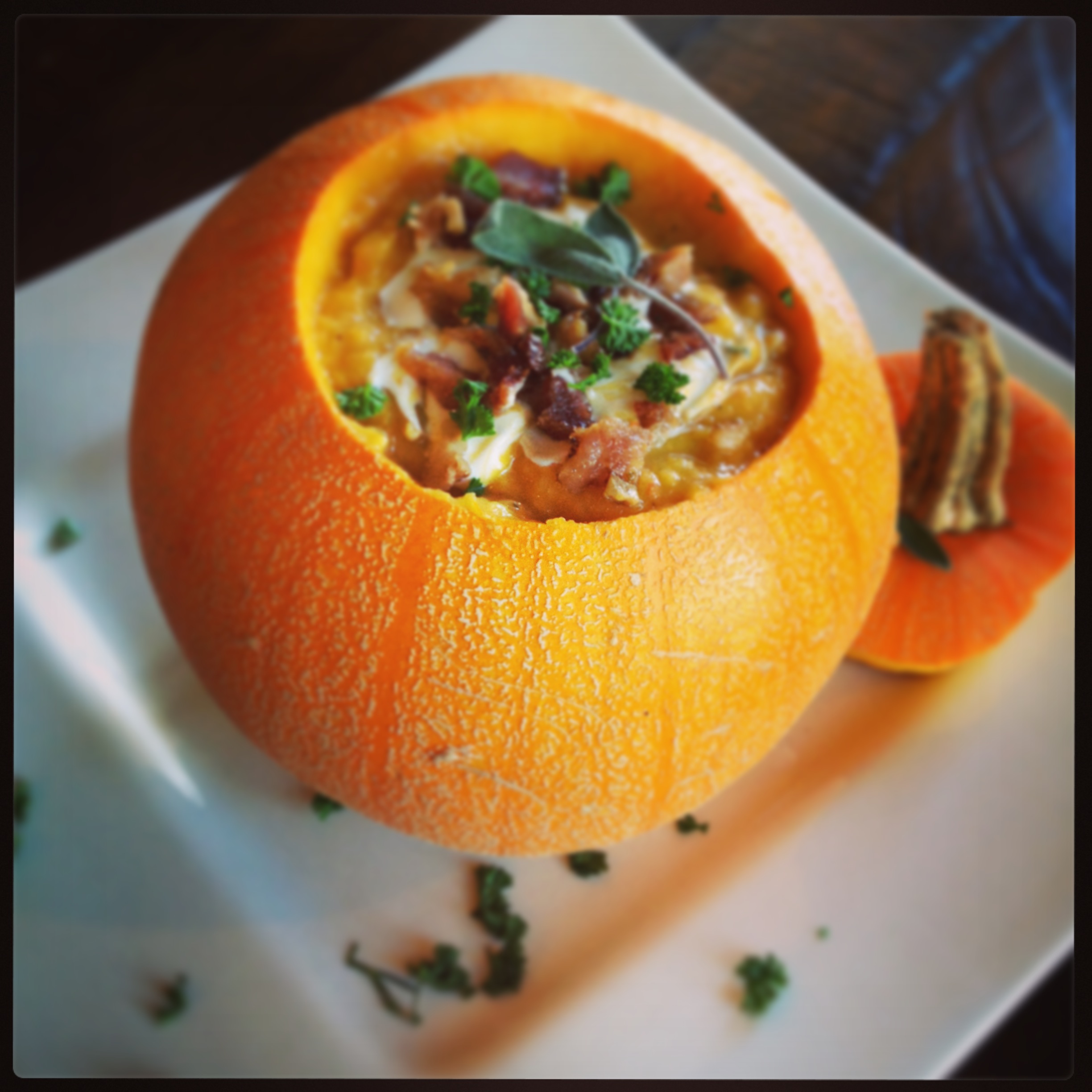 While your pumpkin is roasting, cook bacon in a cast iron pot, such as a Le Creuset, just until crisp. Remove from the pot and set aside. In the same pot, add chopped onion, fennel, celery and carrots. Stirring frequently, until transparent. Add in chicken stock and garlic, simmer on low until cooked all the way through and mushy, yes, mushy. Add the roasted pumpkin to your pot.