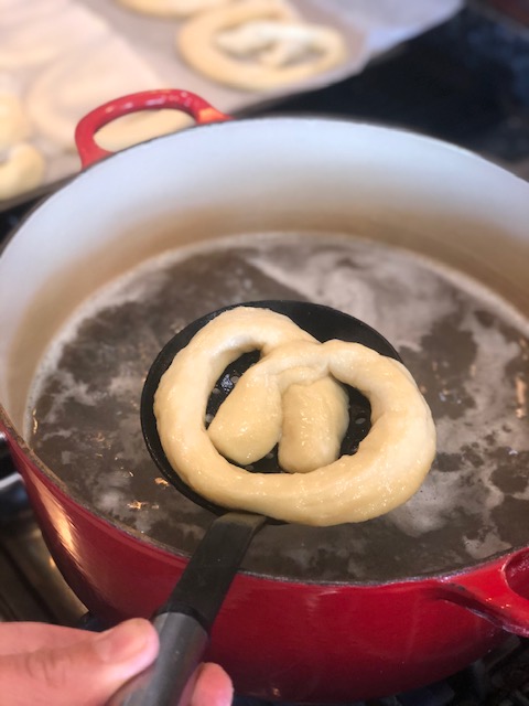- Using a spider, gentle place the soft pretzel into the simmering water. Allow the pretzel to float to the top, using the spider, carefully scoop it out and set it on a parchment lined baking sheet.