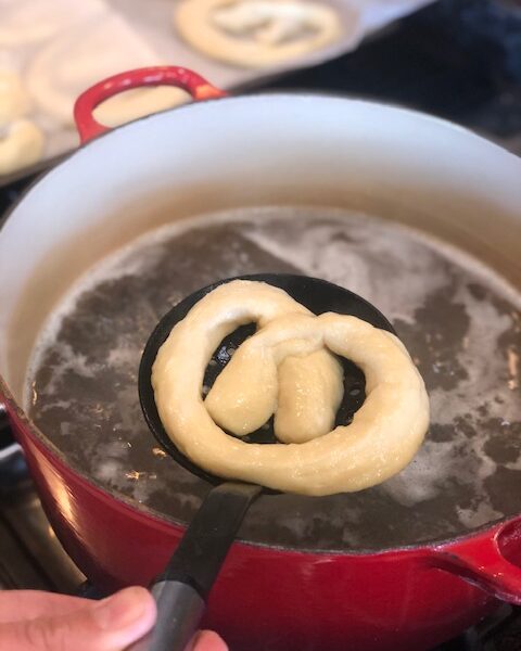 I like to make these up two batches at a time. I shape them into pretzels shape, freeze them on a flat cookie sheet. Once frozen, I pop them in a couple gallon ziplock bags until I have the time to cook them all. The shaped dough forms exceptionally well and is something you can make in advance. When you are ready to make the pretzels, pull them out of the freezer and allow them to thaw for about an hour. Its ok if they are still a bit frozen, as the simmering water will quickly heat them up.